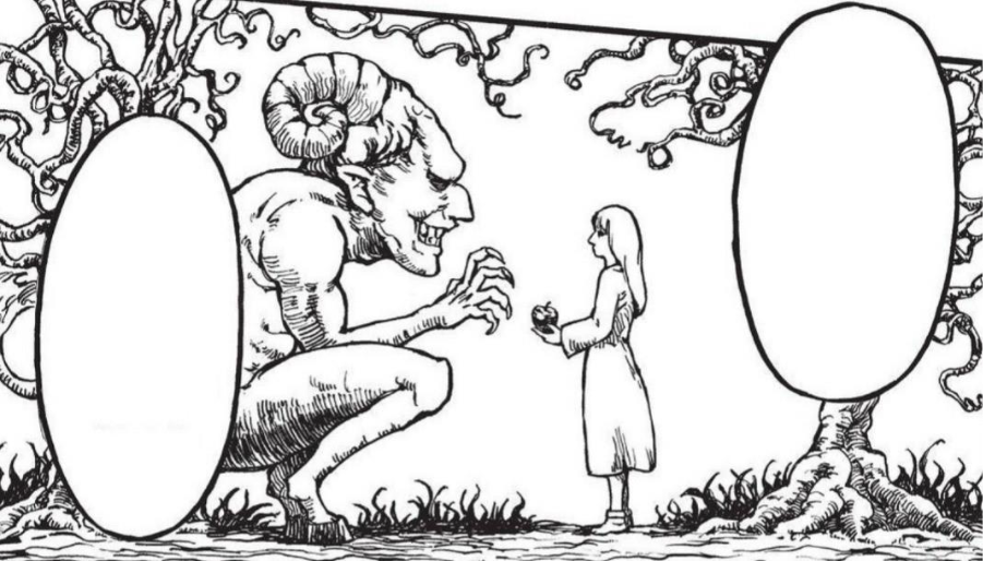 As características que indicam isso são a representação do “Diabo” como uma figura com chifres, consistente com o capacete usado pelos Eldianos da época, incluindo o rei, e que, como ele, seus olhos podem ser vistos completamente no escuro; e a representação de Ymir como uma menina recebendo uma maçã da figura demoníaca (ele entrega a maçã). A maçã é um símbolo de sexualidade, amor, fertilidade, entre outras coisas; portanto, entende-se que Ymir está se entregando fisicamente ao rei.