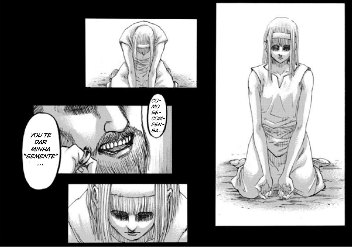Se olharmos de perto a composição da conhecida imagem que representa esse pacto, ela pode ser uma metáfora clara para o momento que vemos no capítulo 122, em que o primeiro rei de Eldia diz que o “prêmio” que Ymir receberá por suas grandes conquistas na guerra é que ele a faria engravidar com sua “semente”. Entendamos, então, logicamente: a origem dos Sujeitos de Ymir está relacionada à primeira geração de crianças com o sangue de Ymir. Essa é a origem.